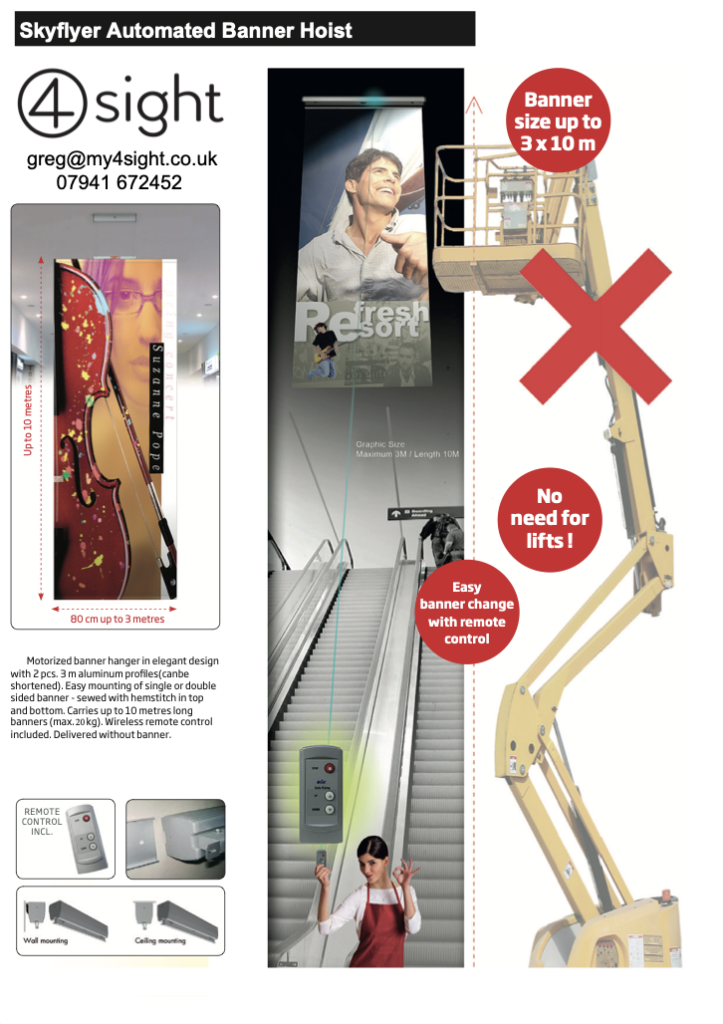The SkyFlyer automatic banner lifter enables you to change high level graphics without the need for ladders of platforms: